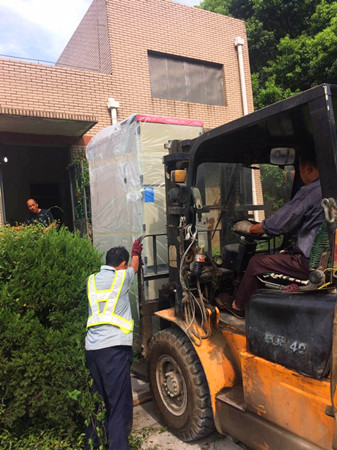 14日上午,寧向隧道實(shí)施了二類封道,維養(yǎng)中心、黃土嶺隧道所與廠家(浙江耀明電力設(shè)備有限公司)施工人員一起,在起重吊機(jī)、叉車等機(jī)械配合拖纜下,合力將6組重達(dá)數(shù)噸配電柜等設(shè)備搬運(yùn)至配電房內(nèi)并恢復(fù)了前一天拆除的護(hù)攔,等待第二天技術(shù)人員的停電安裝。同時(shí),為了第二天盡早開工,中心和黃土嶺提前落實(shí)了油料和參與人員,并預(yù)訂了盒飯,力爭一天時(shí)間完成所有安裝工作。