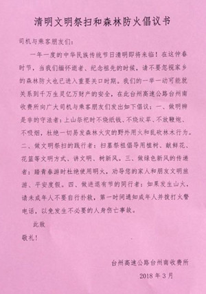 圖為倡議書 為增強防火意識,做到文明祭掃,3月16日上午,臺州南收費所在向過往司乘人員發放《清明文明祭掃和森林防火倡議書》,倡議大家做明辨是非的守法者:不燒紙錢、不放鞭炮、杜絕野外用火和亂伐林木行為;做文明祭掃的踐行者:提倡用植樹、獻鮮花、花籃等方式祭祖;做綠色新風的傳遞者:勸導家人和朋友文明出游;做進退有節的同行者:發生山火,理智救火。