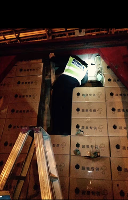 一張照片牽出一輛假冒“綠農(nóng)車” 3月1日凌晨,車號為滬DL1247的廂式大貨車因假冒綠農(nóng)車在臺州收費所被設(shè)卡攔截,司機因涉嫌詐騙被公安機關(guān)帶走調(diào)查。 這輛從溫州南入口、車門上印著“蔬果特快”軸限40噸的115型大貨車,在凌晨2:25分駛?cè)肱_州收費所,司機自稱運送蘋果。當(dāng)檢查人員打開車廂后門,搬開疊放著兩層的蘋果箱后,發(fā)現(xiàn)廂體另有天地,一個用鐵條焊成的架子沿著廂壁固定在廂體內(nèi)部,架子上豎著兩大片木板,木板遮擋了廂體六分之五的面積,透過木板縫隙能看到里面一箱箱的貨物。檢查人員把手伸進包裝箱里,拆開一看,里面全是電動車的配件。