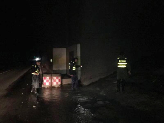 圖為執勤隊員深夜查看豎井集水池 一大早,徹夜未眠的所負責人、執勤隊員又開始緊張忙碌:巡查斜井、邊坡、山體、邊溝部位;檢查南北配電房漏水情況,確保臨時用電安全;查看所轄路段警示牌倒塌或受損情況;及時補充抽水泵等應急物資,增加豎井排水設備,提高排水能力,預防隧道內出現雨水倒灌現象;給停電停水的馬宗嶺隧道人員送去糧食和飲用水等物資,做好后勤保障。
