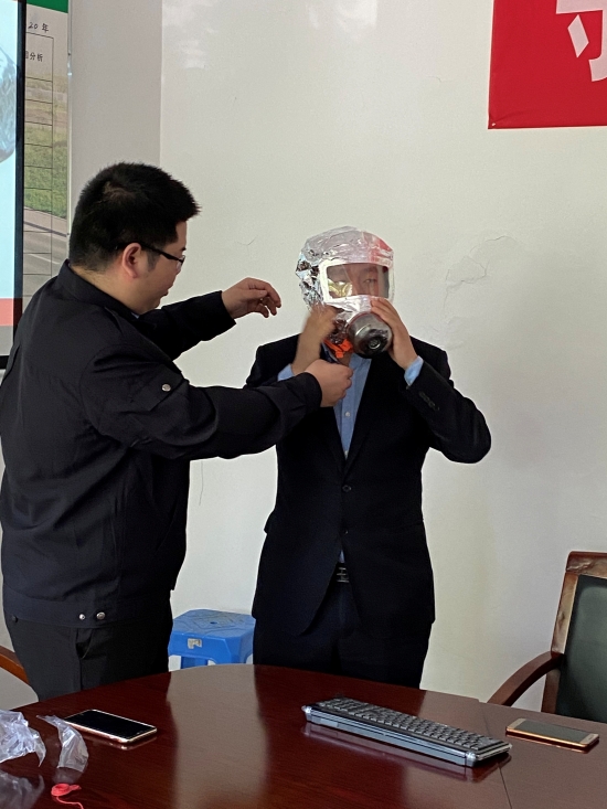 圖為空氣呼吸器佩戴演練 培訓(xùn)分為講座和演練兩個部分。在培訓(xùn)課上,臺州消防大隊(duì)楊教官結(jié)合近年來發(fā)生在臺州觸目驚心的火災(zāi)案例,以視頻、圖片的形式生動地闡述了消防安全工作的重要性和嚴(yán)峻性,通過現(xiàn)場展示詳細(xì)介紹了干粉滅火器、水基滅火器的各自特點(diǎn)和使用方法、適用的場所,全面介紹了日常工作生活中應(yīng)注意的消防安全細(xì)節(jié)以及如何撲救初期火災(zāi),火災(zāi)中如何自救、空氣呼吸器佩戴使用、逃生等知識。