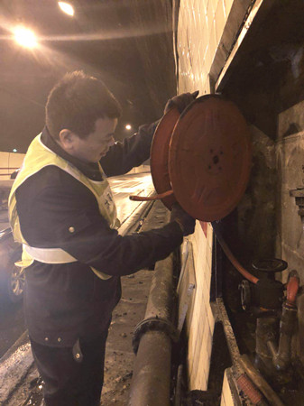 圖為檢查人員在檢查消防卷盤 大溪嶺隧道所負(fù)責(zé)人向來客介紹,隧道清洗工作需集團(tuán)下屬的施救中心、維養(yǎng)中心、隧道所員工,以及外協(xié)單位、養(yǎng)護(hù)公司等人員的積極配合,分工合作,將利用兩天時間完成大溪嶺雙向隧道的清洗維修任務(wù)。張金財再次稱贊表示,控制隧道清洗時間能有效地緩解地方交通壓力、節(jié)能減排。 2018年度春運即將開始,各方檢查人員借此次隧道清洗機(jī)會,全面排查影響隧道暢通的安全隱患,做好隧道內(nèi)設(shè)備設(shè)施的維修保養(yǎng)工作,為創(chuàng)造平安節(jié)日提供保障。 陳智慧