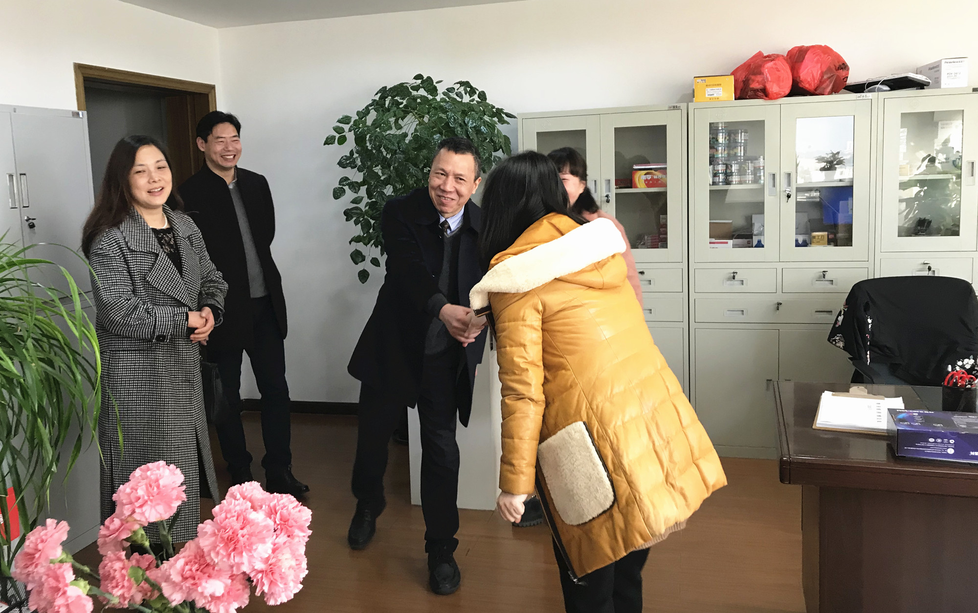 圖為集團副董事長、總經理張建平在慰問中與部門員工親切握手