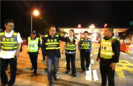 “要分成幾道防線對來車進行引導,安排三個人站在這個位置,把小車和客車引往左側四個車道,貨車往右邊這三個車道引。”分流開始前的半小時,章海峰仍在細心地安排部署著,并囑咐封道公司人員:“夜間分流,你們要格外注意自身安全,反光背心要穿戴好,閃光指揮棒也要隨時開著。”
