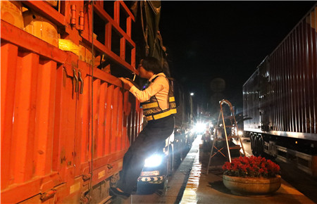 夜間綠農車輛多,據統(tǒng)計,當天凌晨早班臨海南收費所出口綠農車108輛,是平時日均數量的八九倍。短時間內的“井噴式”增長,這又是一個大考驗。“三號綠色”、“一號綠色”、“二號綠色”……“來啦!”旁站人員箭步沖過去拍照取證、檢查車輛。大貨車又高又寬,平時需登專用扶梯進行檢查,可在大流量面前保安全省時間是第一要旨,這些個巾幗女將們面對高貨車,一手拉著車把,一腳踩在車杠上,迅速上車開展核查,執(zhí)行速度絲毫不遜于男同志。有時剛從這輛貨車上下來,又立刻奔向了其它車道。晴夜當空,車道間一個個忙碌的身影不停穿梭著,卻不言乏力。