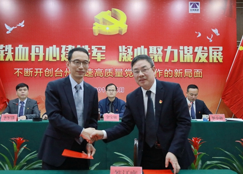 圖為集團(tuán)領(lǐng)導(dǎo)陳文波與各支部書(shū)記簽訂責(zé)任書(shū)后握手