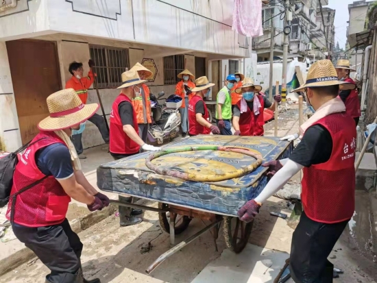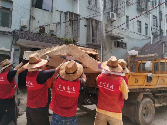 圖為臺(tái)州高速志愿者支援災(zāi)區(qū)重建現(xiàn)場(chǎng) 在臨海古城赤城路米篩巷,臺(tái)州高速集團(tuán)的志愿者們頂著毒辣的太陽,不怕臟不怕累,積極為災(zāi)后重建貢獻(xiàn)力量,清理路面淤泥、垃圾,保障路面清潔以及道路順暢。 真情傳遞溫暖 愛心匯聚力量, 面對(duì)災(zāi)后重建, 臺(tái)州高速集團(tuán)用實(shí)際行動(dòng), 彰顯鐵軍精神, 承擔(dān)社會(huì)責(zé)任, 展現(xiàn)使命擔(dān)當(dāng)。