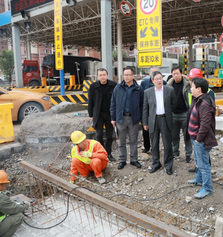 圖為陳文波在收費(fèi)所混合車道施工現(xiàn)場(chǎng)了解施工進(jìn)展情況