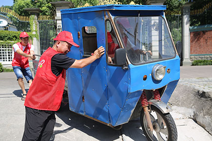 上圖為志愿者服務隊合力推離停放不規范的電瓶車、三輪車