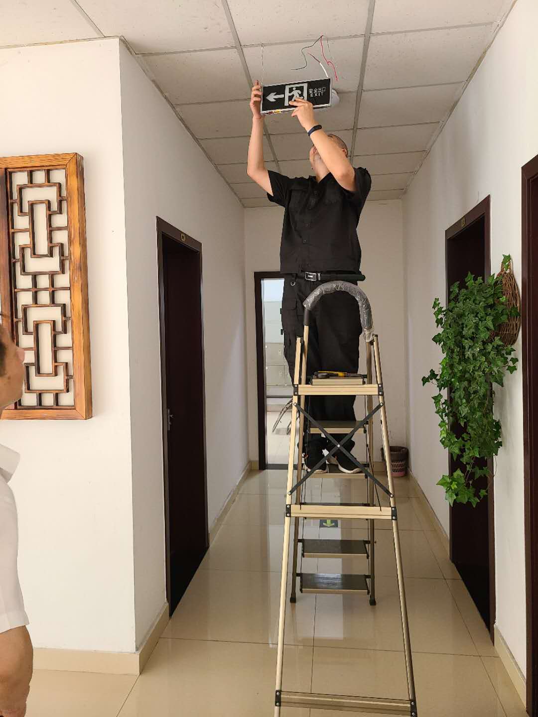 圖為技術人員安裝現場 在得知這一情況后,維養中心積極協助收費站所購買相關的主材及配件,并主動承擔了這些設備安裝工作。由于設備安裝位置很多沒有直接可用電源,中心技術員們就從四五米外甚至更遠的地方,一路套管放線過來取電,并用電錘等工具為其開孔固定,最后再完成接線送電。經過2天努力,這些帶有方向提示標識、安全出口標識的燈牌被安裝在各層樓梯出口、拐角或主要通道上,因全部帶有儲電功能,即便在斷電的情況下也能發光發亮。