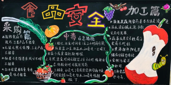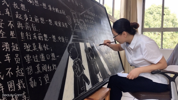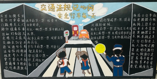 活動前期,臨海南收費所臨時組建五人板報小分隊,充分利用空余時間搜集有關安全教育資料,對內容、畫面進行認真整理、篩選。最終決定三個板塊,以提高安全教育為目的,以不同風格主題來呈現,從多方面、多角度設計與繪制,達到了更好的安全教育宣傳效果。 活動開展后,參與者們分配好各自的任務后,出黑板報的工作便熱火朝天地展開了。大家利用自身的特長,通過粉筆字、繪畫等藝術形式,對黑板報進行了精心的設計,主題鮮明,內容充實,圖文并茂,趣味性強,全方位、多角度地宣傳了《消防安全》、《食品安全》、《交通安全》三大主題。其中在交通安全宣傳方面,如何使交通安全內容,更加直觀形象、簡單易懂的、眾人易于接受呢?大家通過反復嘗試,決定打破傳統模式,避免枯燥說教,把交通宣傳教育知識融入到兒歌中,通過朗朗上口的兒歌形式,傳達一些基本的交通規則,幫助大家養成自覺遵守交通規則的意識,提高自我安全防護能力。最后經過大家日夜趕工,黑板報的工作在大家的共同努力下順利完成。