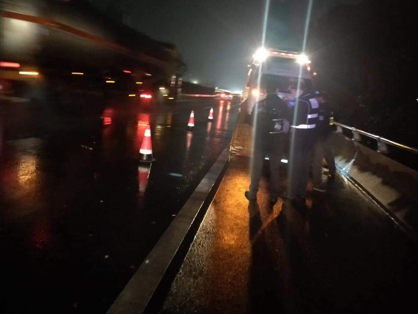 距離事故點(diǎn)最近的院橋駐點(diǎn)施救人員陳偉與潘志平接到指揮中心指令后分別駕駛一輛小拖車和一輛大拖車趕往現(xiàn)場(chǎng)進(jìn)行拖車施救。在途經(jīng)事故堵車后方路段時(shí),另外一輛半掛車與兩輛小轎車追尾并撞到中央護(hù)欄,為了確保路段盡早通暢,他們決定將這起剛發(fā)生事故的車輛先拖離,前方事故則由黃巖駐點(diǎn)人員前來施救。