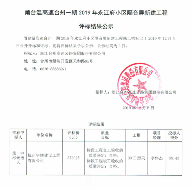甬臺溫高速臺州一期2019年永江府小區(qū)隔音屏新建工程評標結果公示