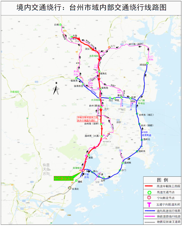 屆時雁蕩、溫嶺西(大溪)、臺州南(院橋)、臺州(黃巖)寧波方向關(guān)閉14天,臨海南、臨海北互通寧波方向進(jìn)口關(guān)閉7天,洋頭互通上虞方向進(jìn)口關(guān)閉7天,所有車輛禁止上高速;溫州方向進(jìn)出口將根據(jù)改道需要臨時關(guān)閉。