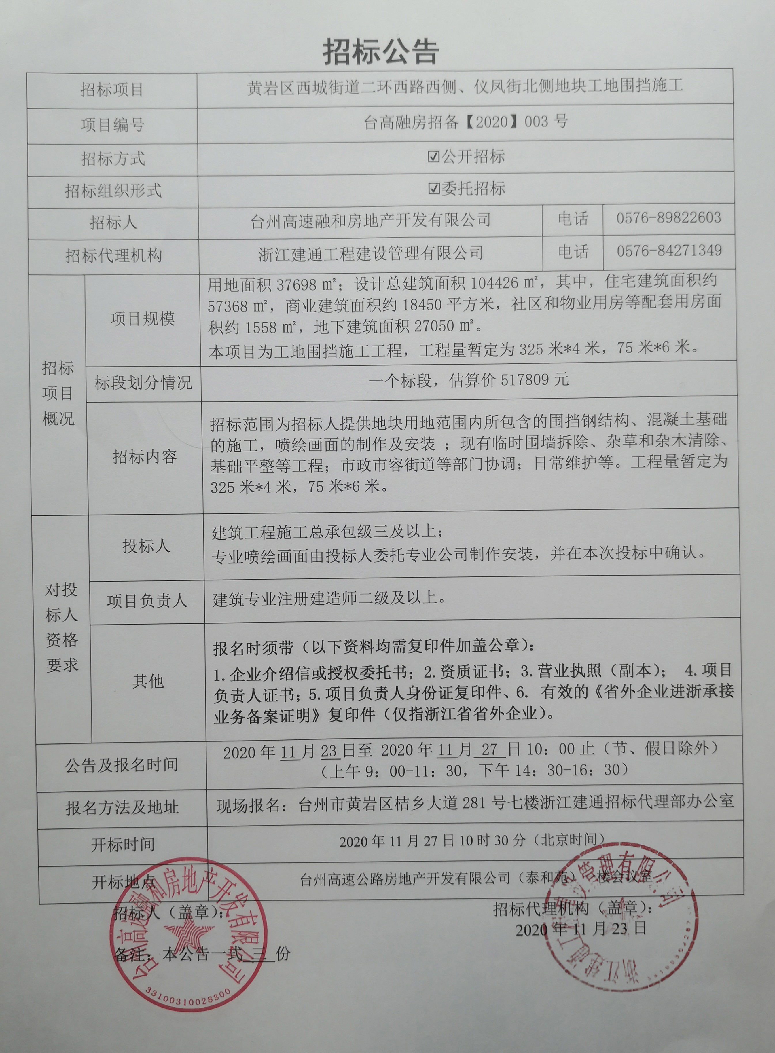 黃巖區西城街道二環西路西側、儀鳳街北側地塊工地圍擋施工招標公告