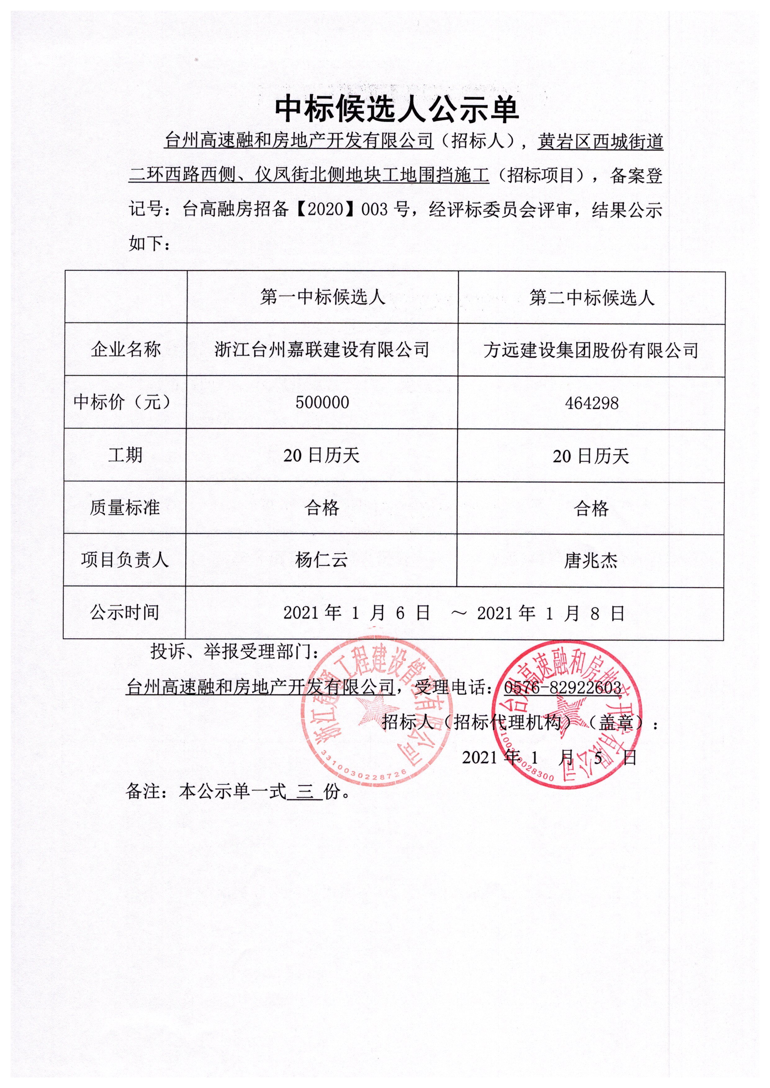 黃巖區(qū)西城街道二環(huán)西路西側(cè)、儀鳳街北側(cè)地塊工地圍擋施工中標候選人公示單
